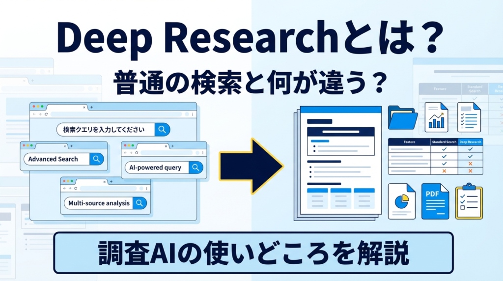 Deep Researchとは?先に結論をいうと「答えを返すAI」ではなく「調査を進めるAI」です Deep Researchとは、AIがユーザーの代わりに情報収集・比較・整理・要点抽出・レポート化までを一段深く進める考え方、またはその機能群のことです。 これまでの生成A... -