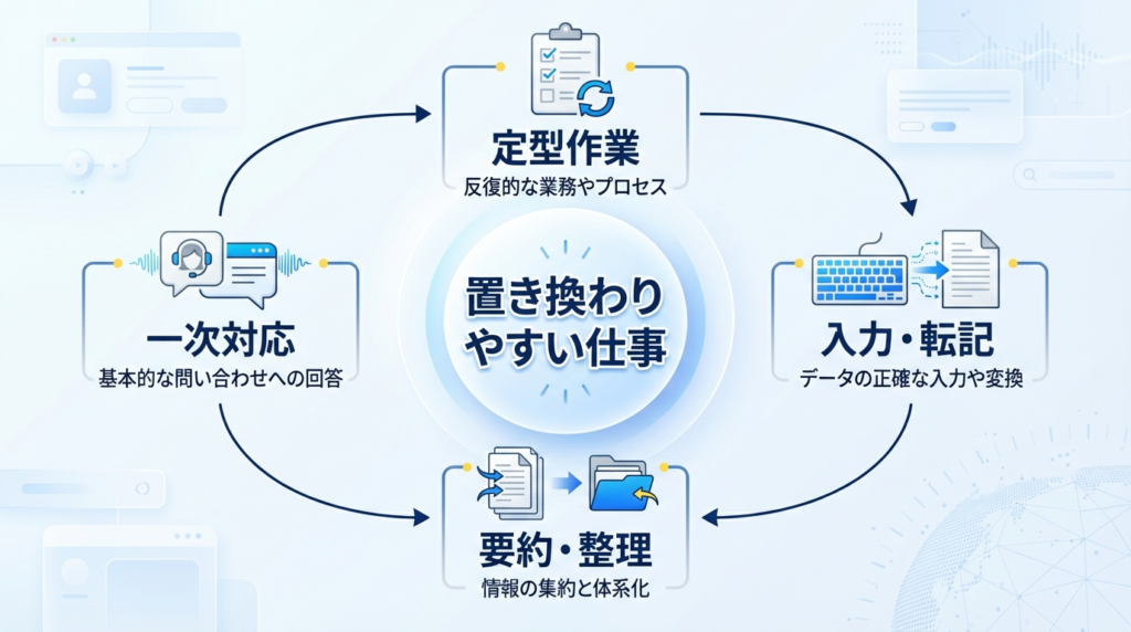 特に、情報収集、要約、下書き、初期分析、一次対応、定型連絡などの“入り口業務”はAIとの相性が良く、ここが一番不安視されやすいポイントです。