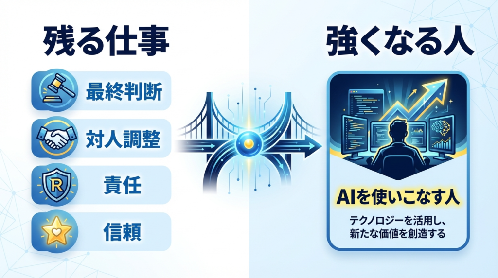 最終判断、対人調整、責任ある意思決定、交渉、現場対応、信頼関係づくりが重要な仕事は残りやすいです。