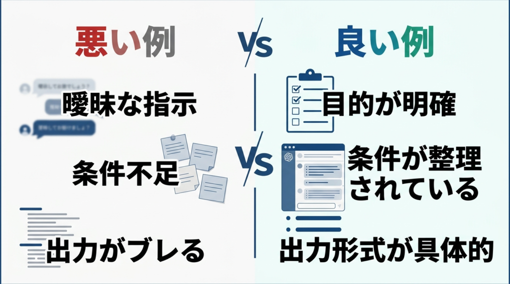 「要約して」「考えて」「作って」だけだと、ChatGPTは何を優先すべきか判断しにくくなります。その結果、無難だけど使いにくい答えになりやすいです。