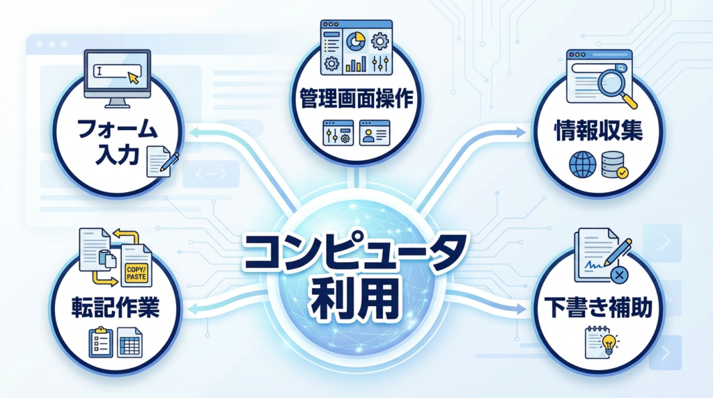 たとえば、フォーム入力、情報収集、Web上の操作、定型的な事務作業の一部などは、Computer Use系の考え方と非常に相性が良いです。
